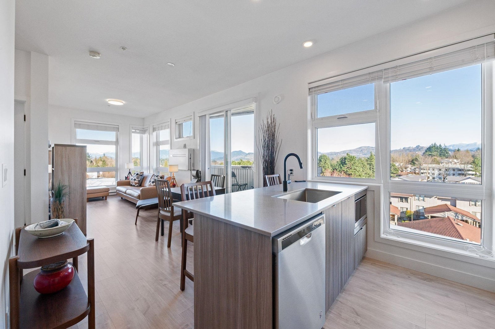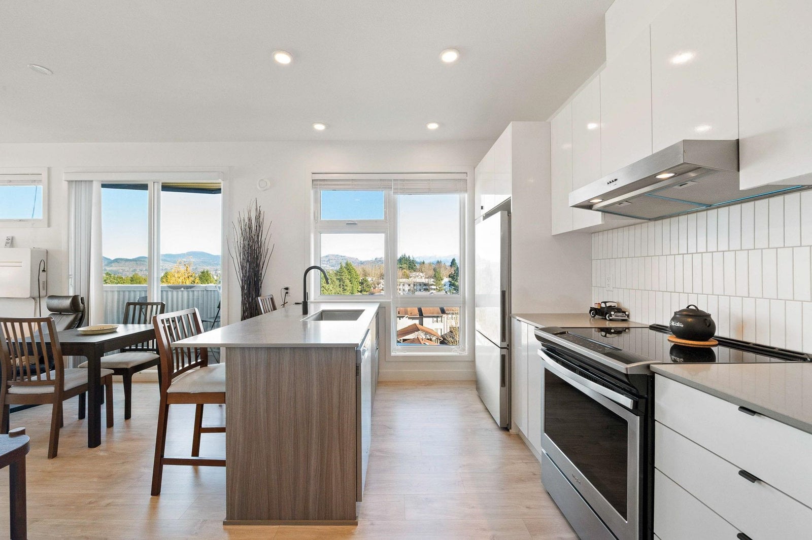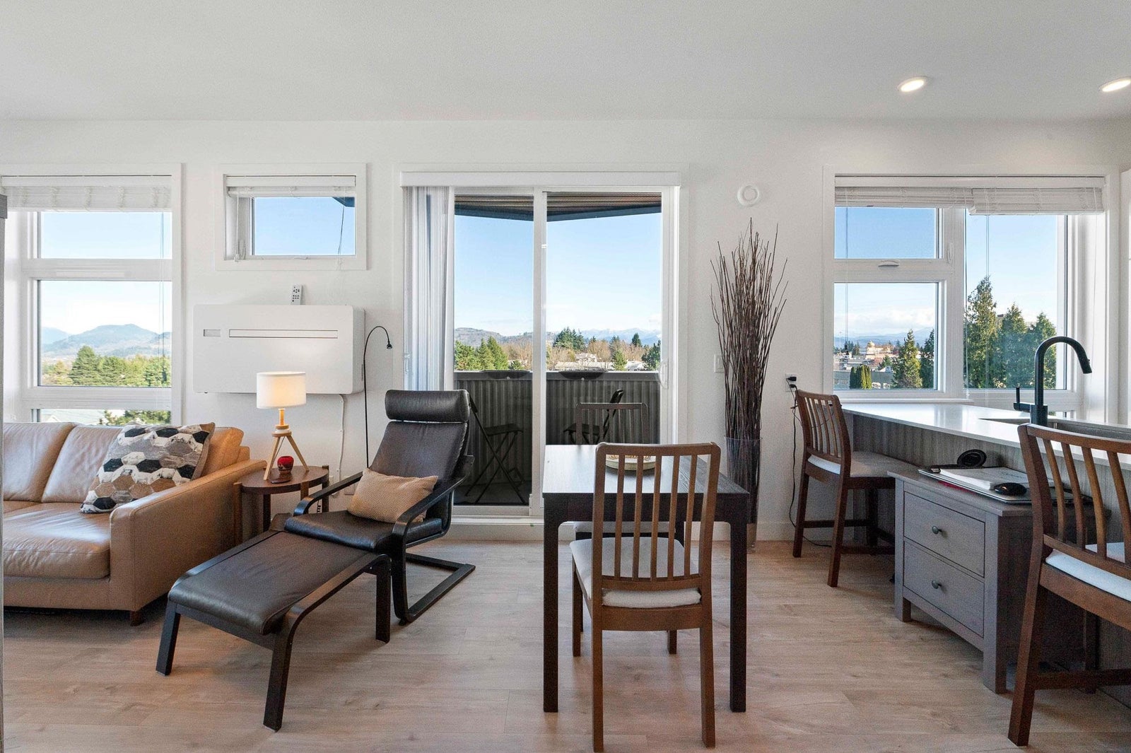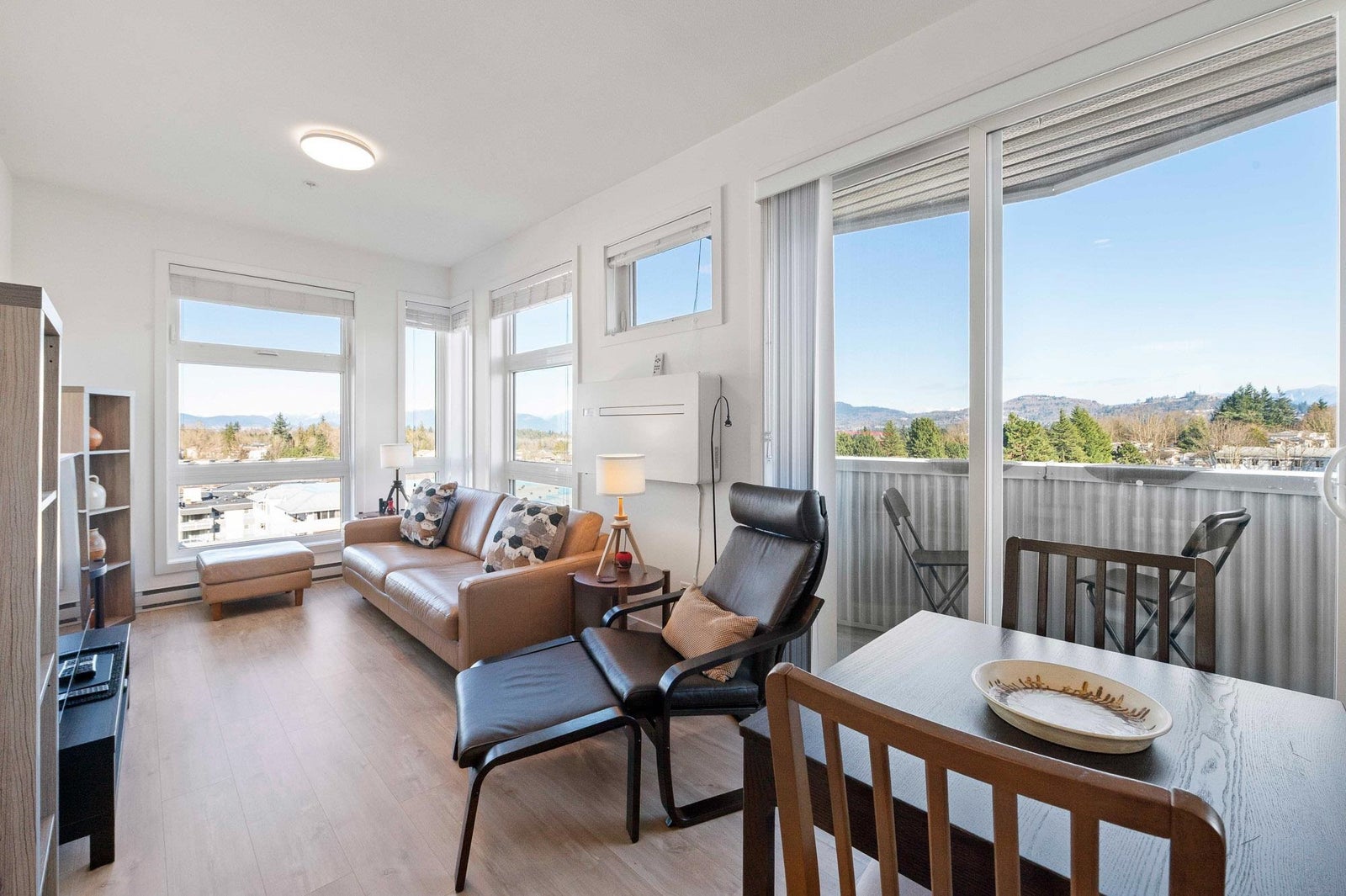 Penthouse living at The Court. Stunning Corner Unit with 180+ unobstructed views to enjoy your morning coffee. Amazing views from every room of Snow Capped Mountains to Mount Baker and beyond. Enjoy the solitude of top-floor privacy in this bright 1 bed, 1 bath home with floor-to-ceiling windows, 9' ceilings, and an open-concept 630 sq ft layout. One of Abbotsford's finest one bedroom condos. Modern kitchen with quartz countertops, stainless steel appliances and a large island. Brand-new A/C/Heat Pump. Upgraded bath fixtures. Two large, secured parking stalls including EV charger, plus an oversized storage locker. Steps to restaurants, cafes, shopping, transit, recreation, Mill lake, Hospital and Hwy. 1. Ideal for first-time buyers or downsizers. Call today for your private viewing.